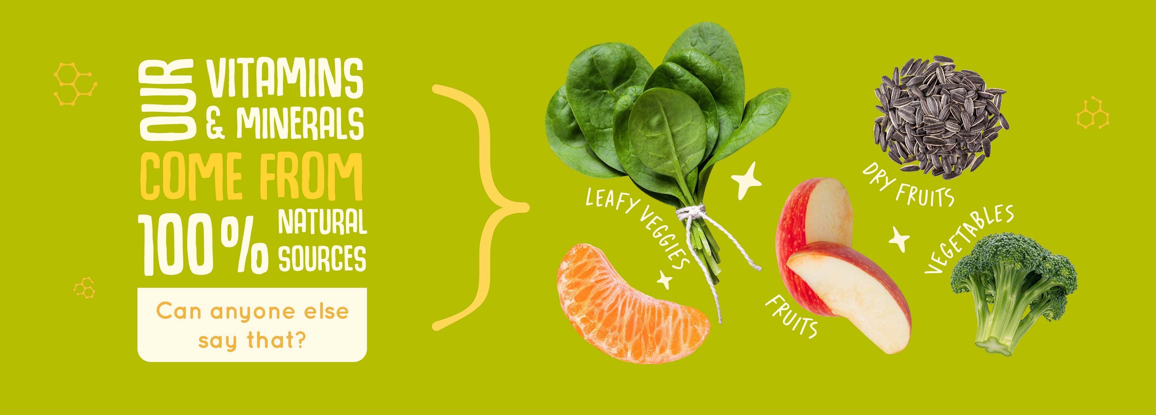 Rice (32.4%), Moong (32.4%), Jowar (15.9%), Coconut Milk Powder, Spinach (5%), Mint, Mixed Spices, Vitamins and Minerals from fruits and vegetables (Broccoli, Carrot, Sweetpotato, Orange, Apple, Strawberry, Sunflower Seeds), Ghee